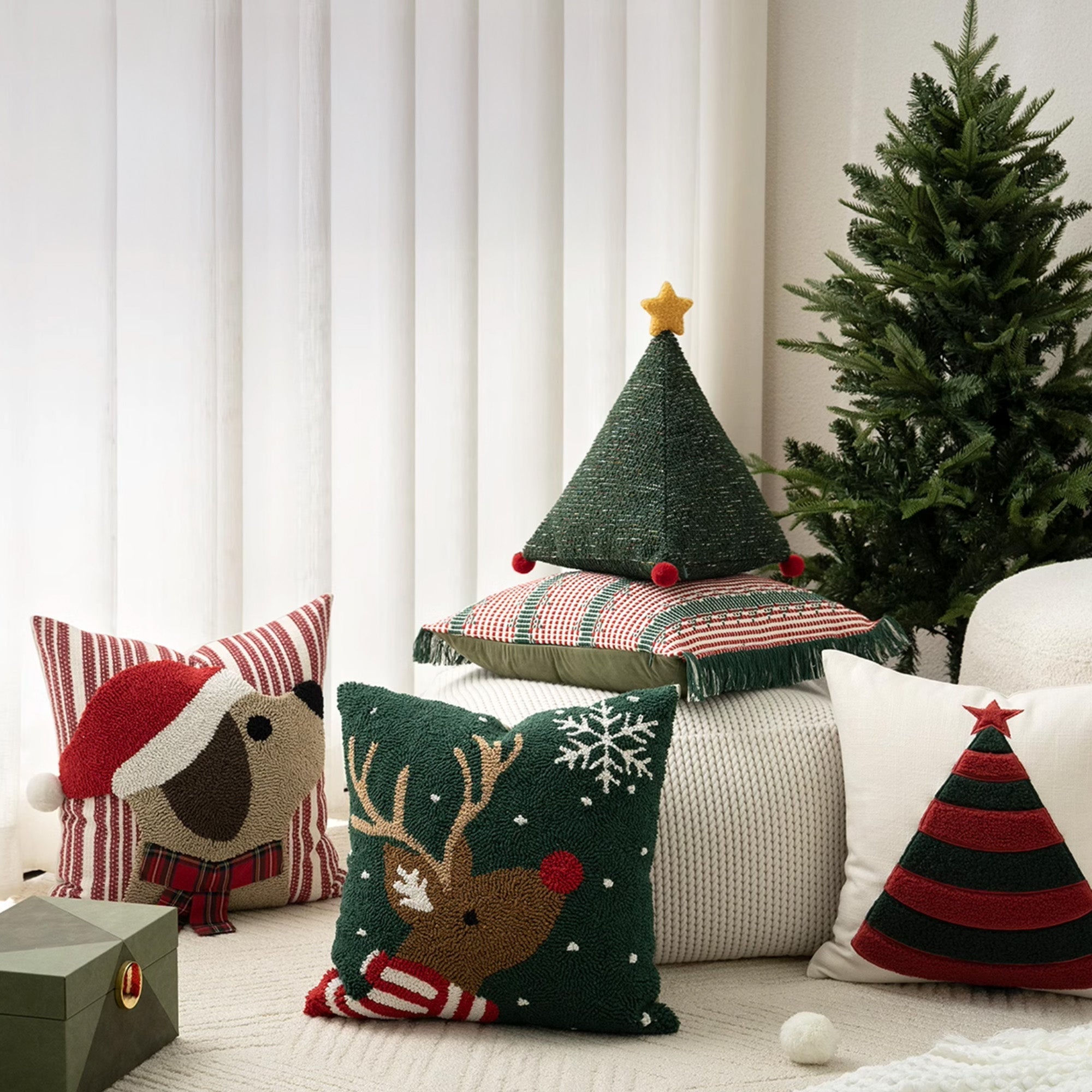 Este diseño añadirá un toque alegre y elegante a tu decoración navideña, ya que combina el encanto atemporal de las estrellas con el toque divertido de las borlas. Es perfecto para Sprea. Estas almohadas se complementarán a la perfección, ya que combinan la calidez del rojo con la energía festiva de las estrellas verdes para crear un ambiente festivo elegante y acogedor.