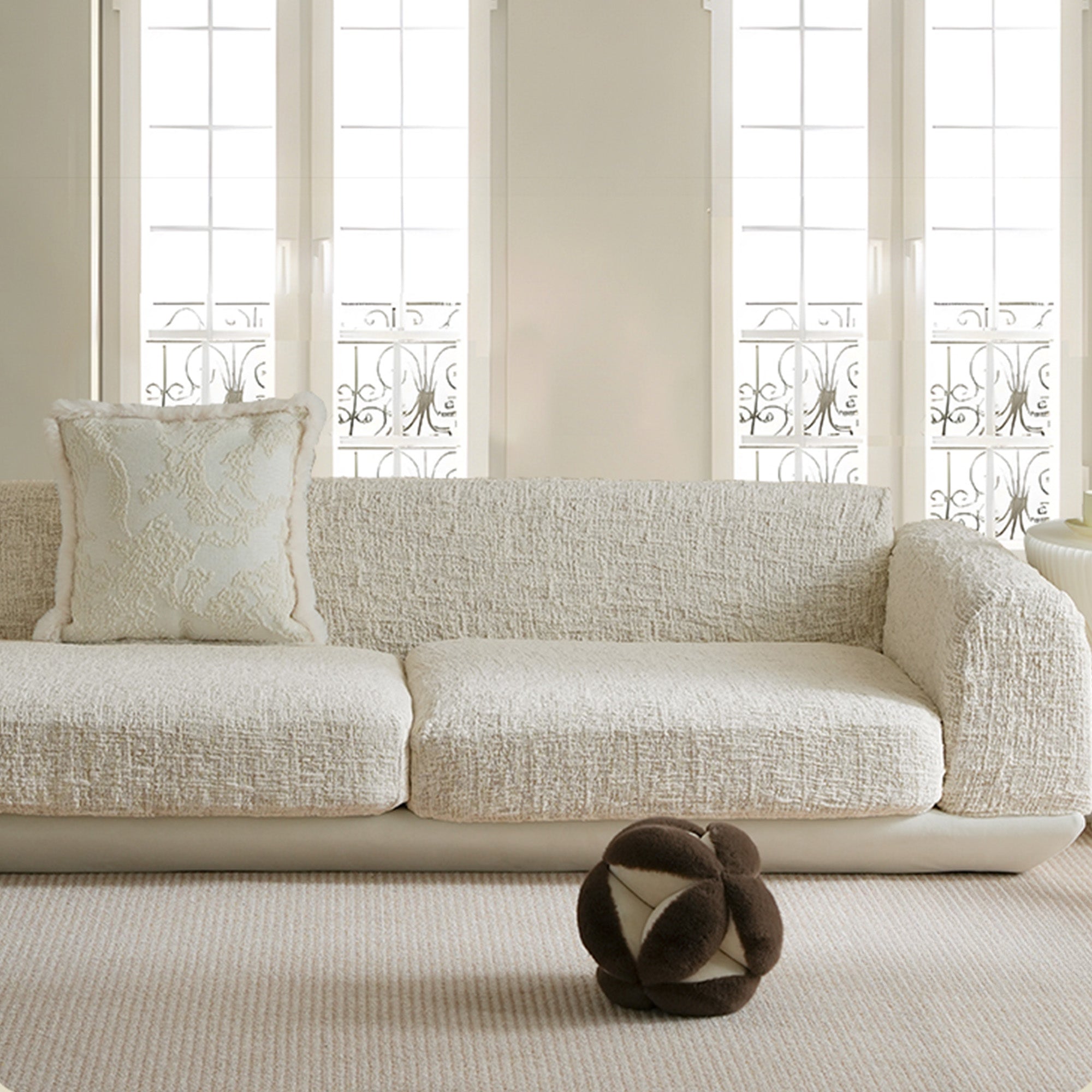 Realza tu espacio vital con nuestra lujosa funda elástica para sofá Sculpted Guard en tejido marfil. Diseñada para ofrecer belleza y resistencia, esta funda de jacquard de alta densidad envuelve todo tu sofá con una suavidad lujosa, una textura densa y un agarre inigualable. Ya sea que estés descansando, saltando o conviviendo con mascotas enérgicas, esta funda se mantiene impecable en su lugar: sin deslizamientos ni complicaciones.