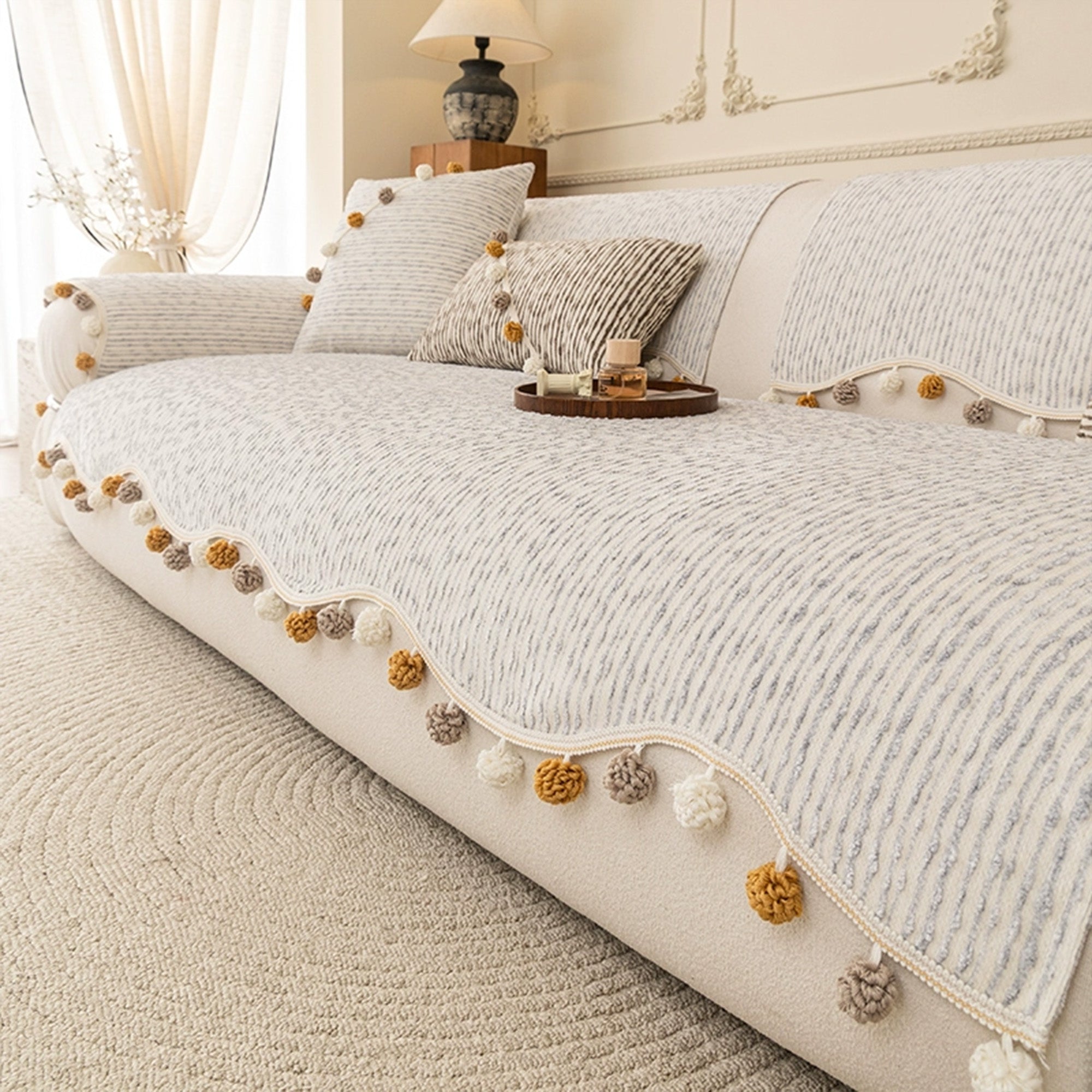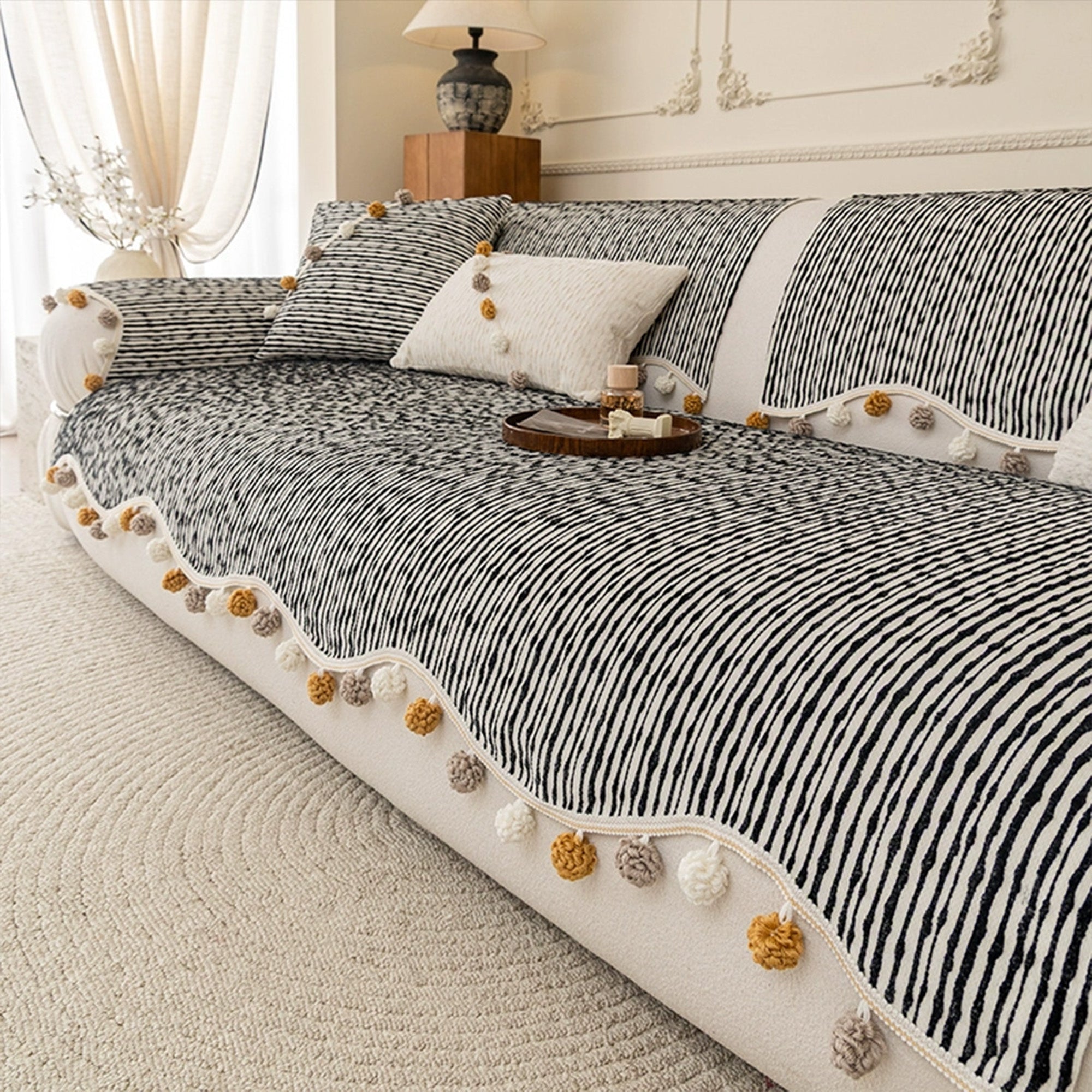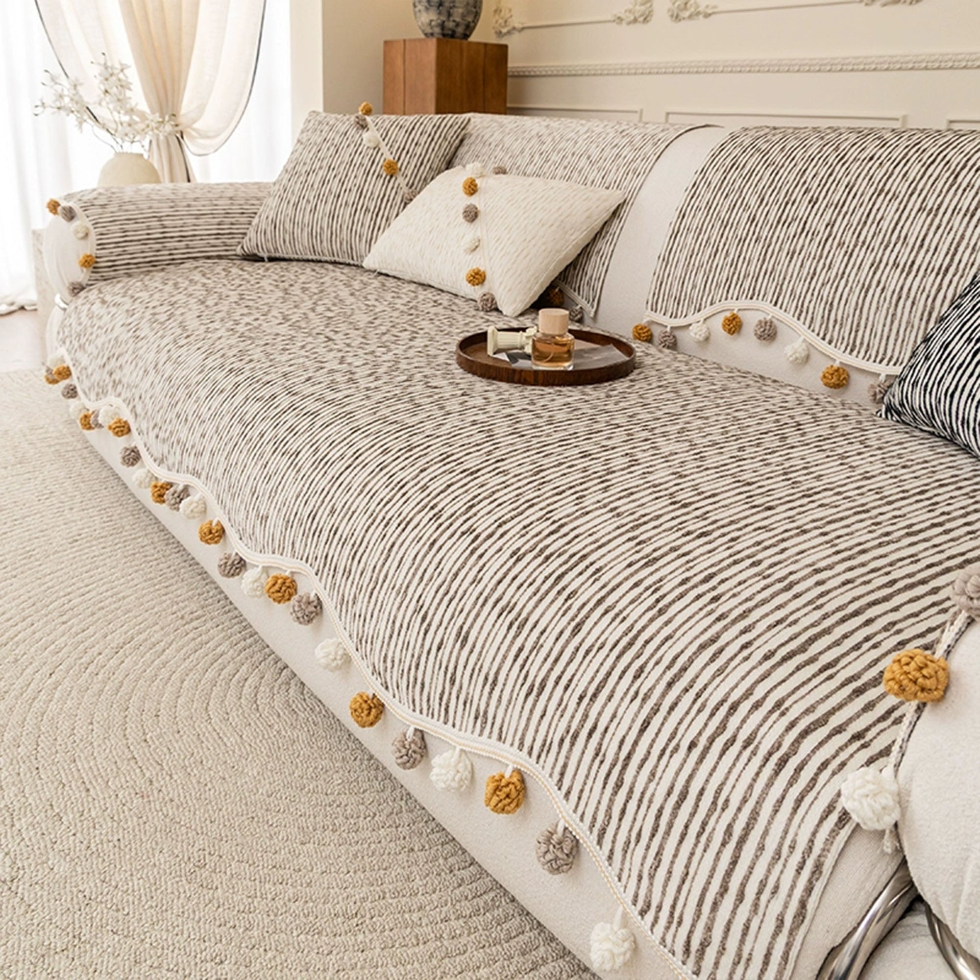 Funda de sofá antideslizante de chenilla con pompones y rayas elegantes