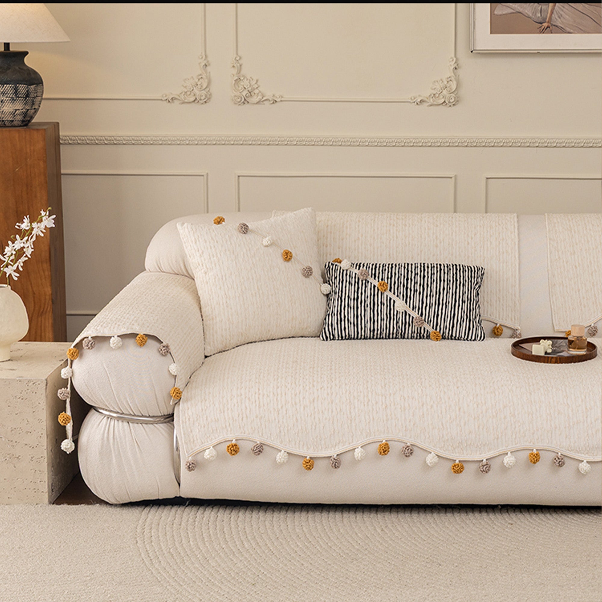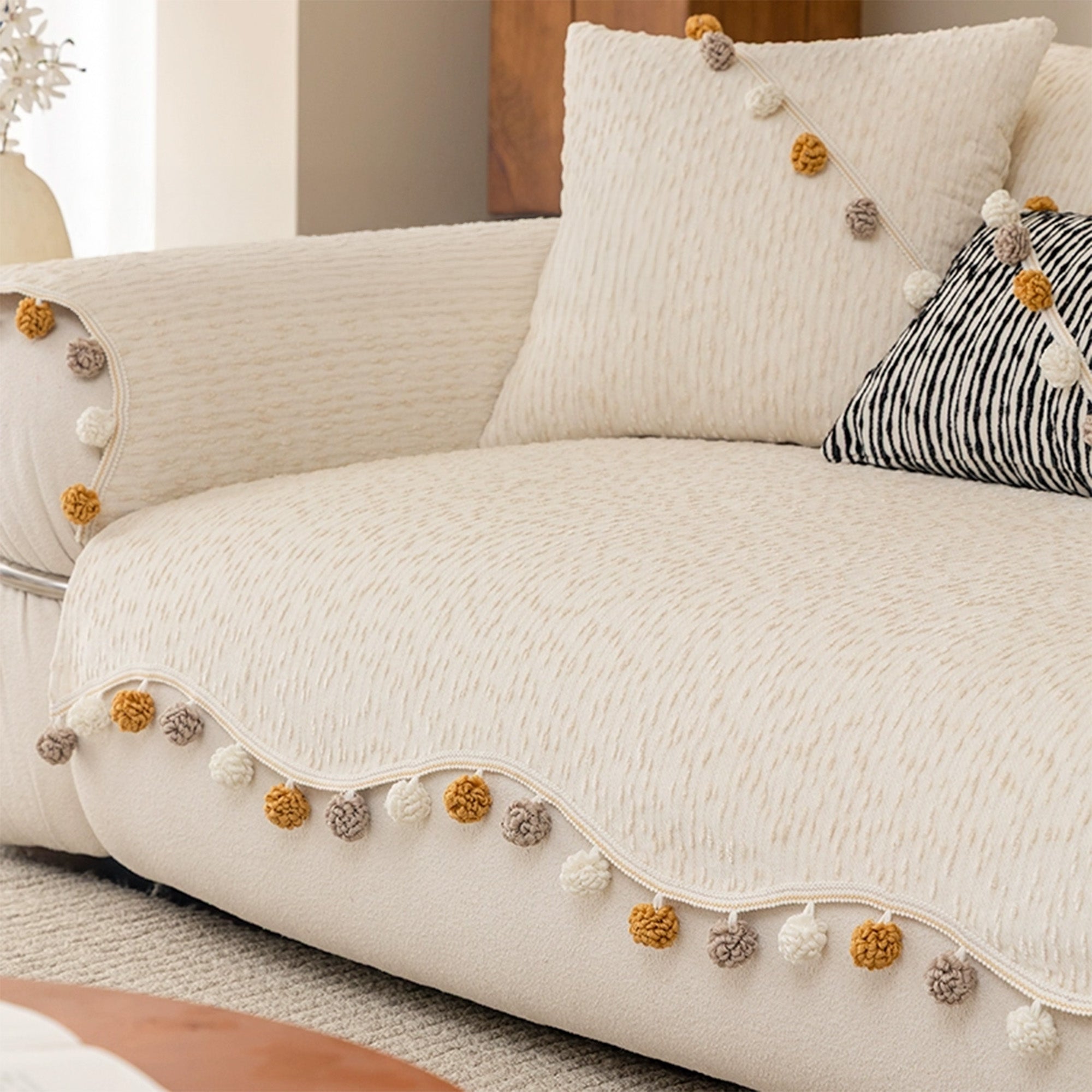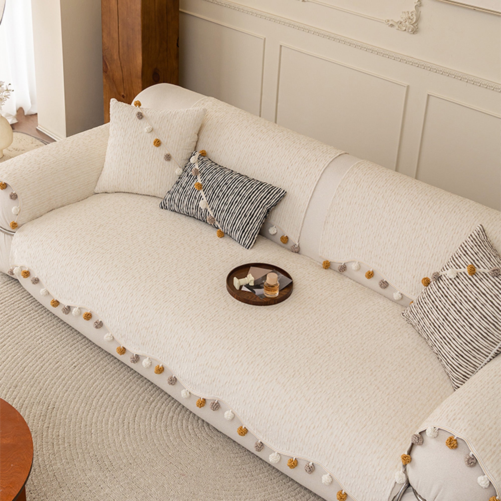 Funda de sofá antideslizante de chenilla con pompones y rayas elegantes