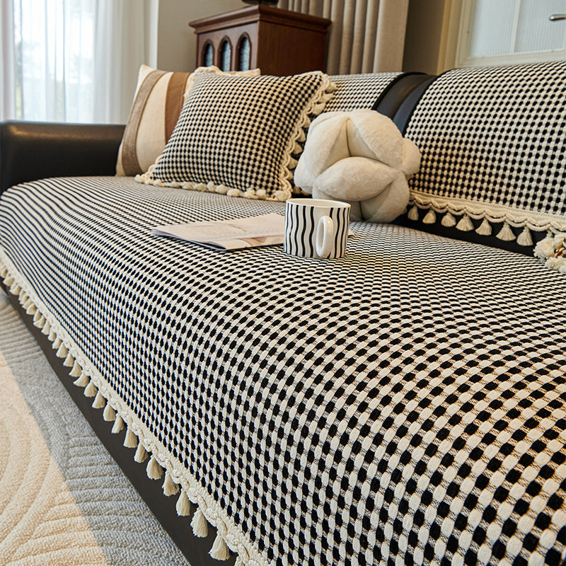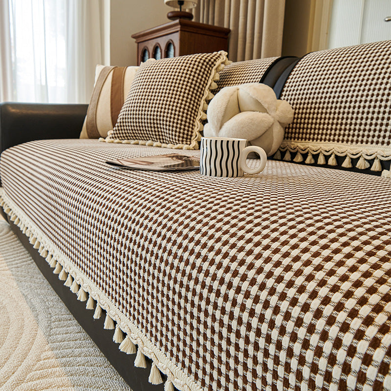 Funda de sofá antideslizante de chenilla con borlas y estampado de cuadros vichy